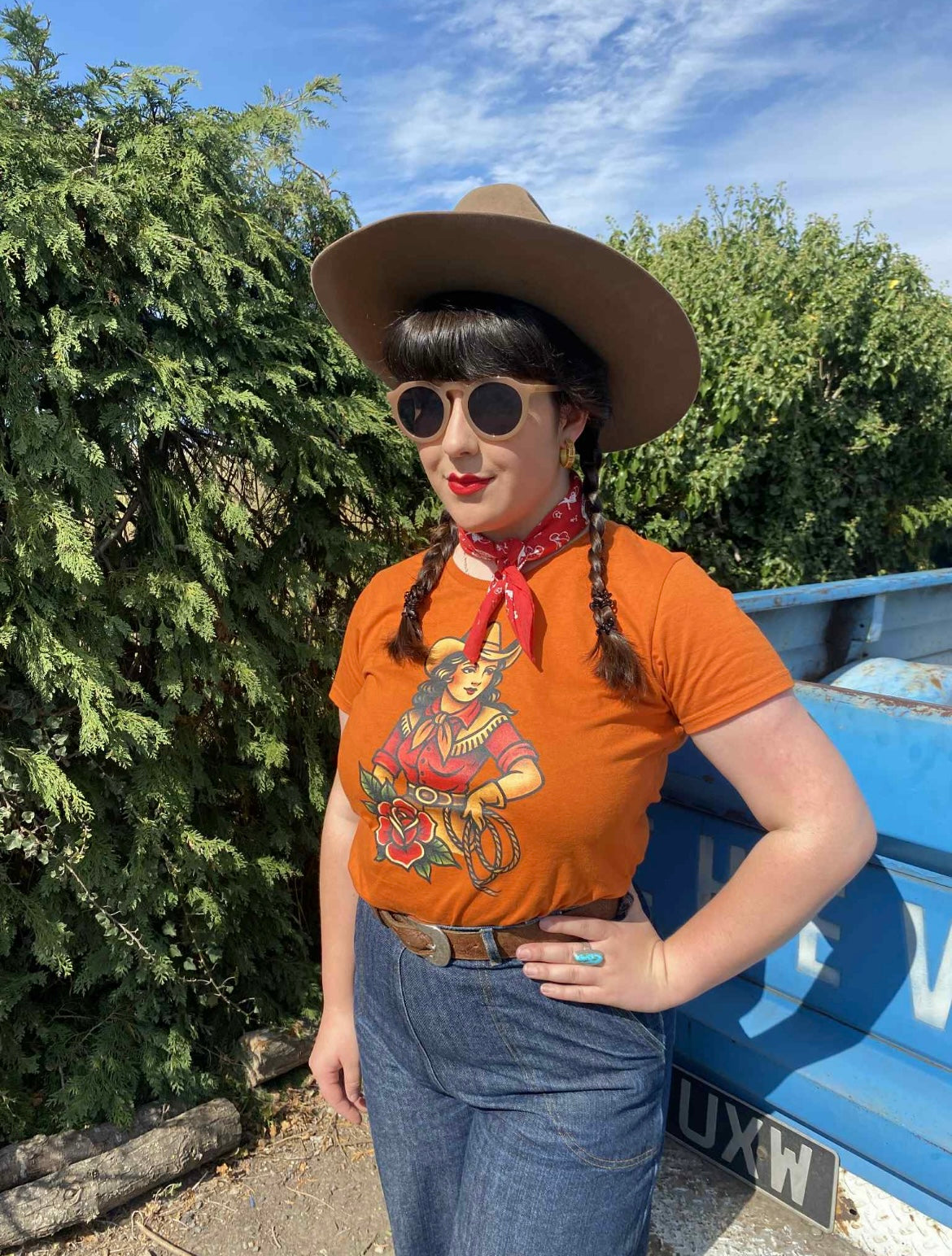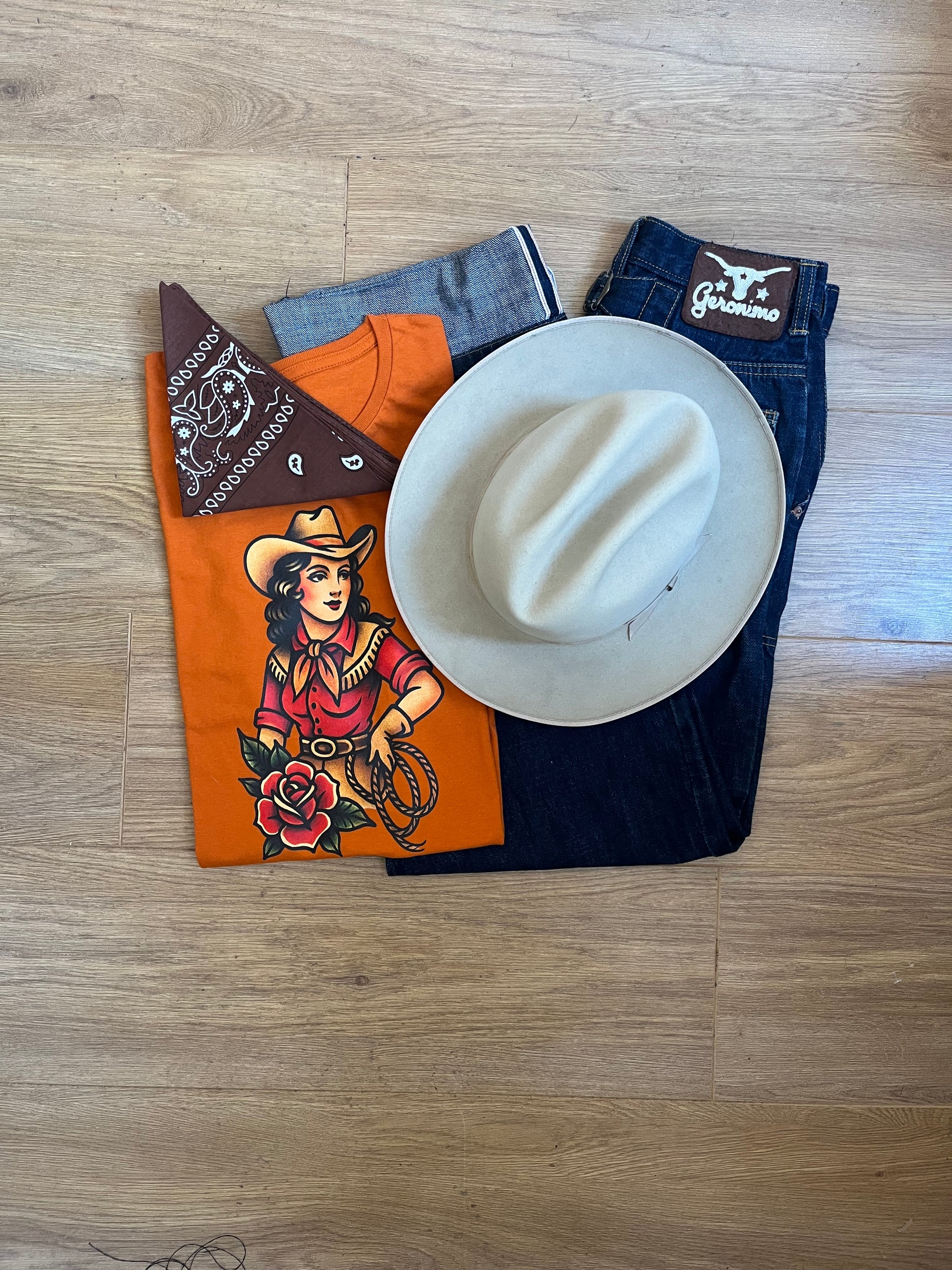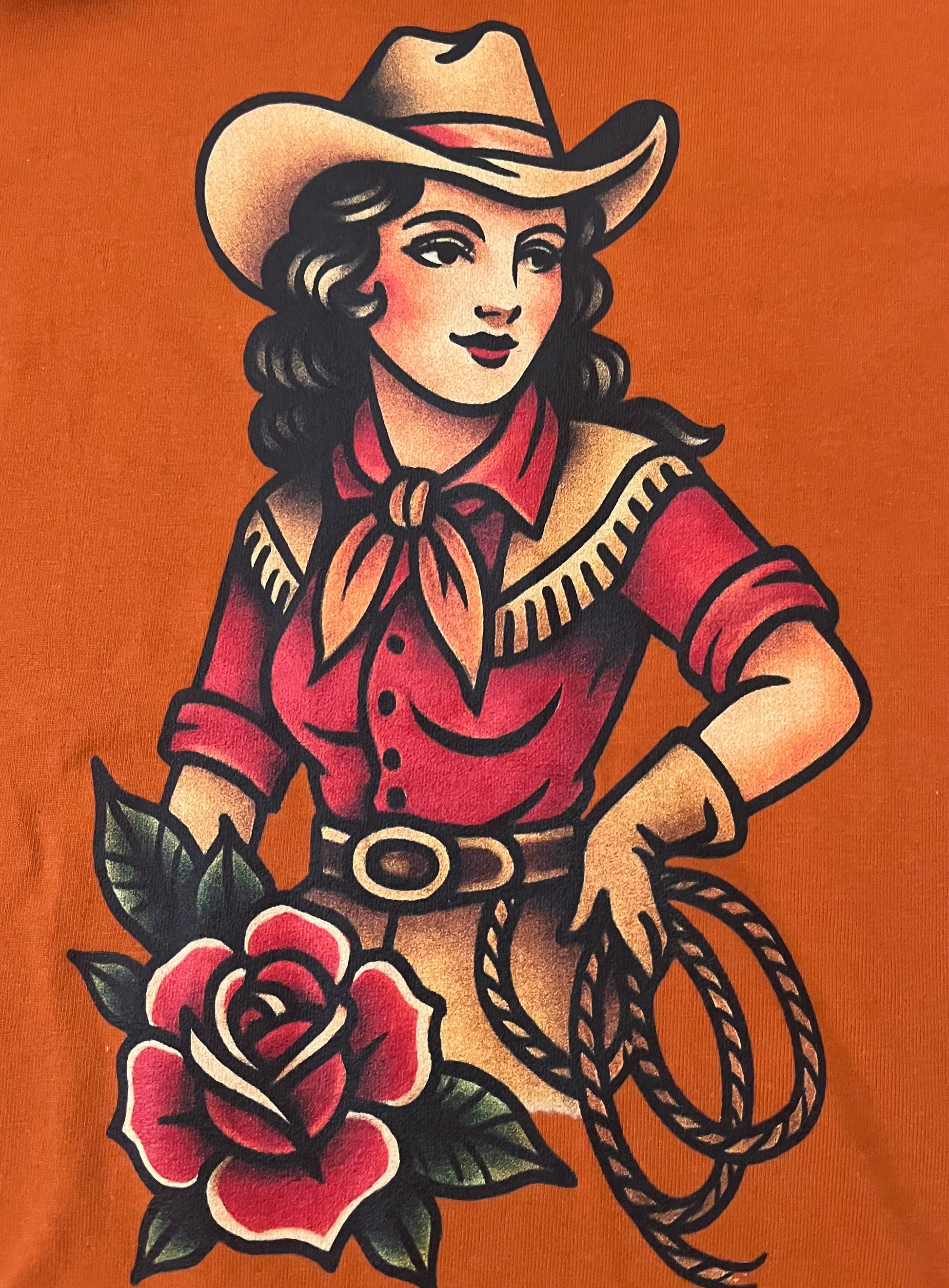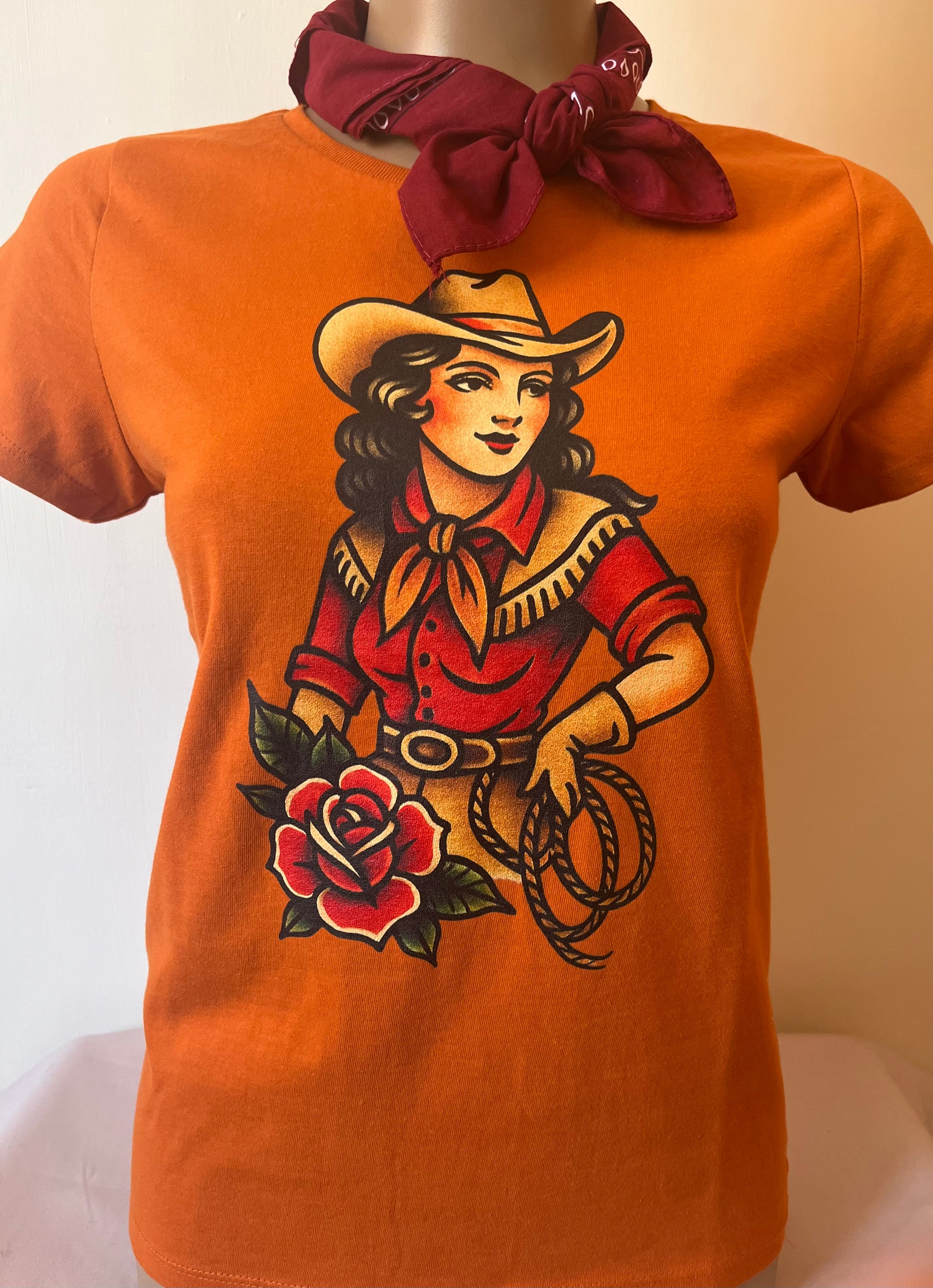 Western rose vintage cowgirl print on a burnt orange t shirt